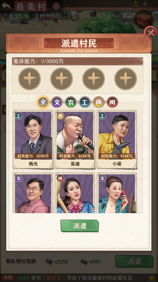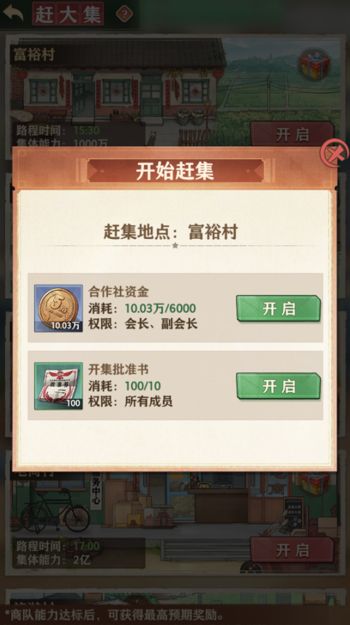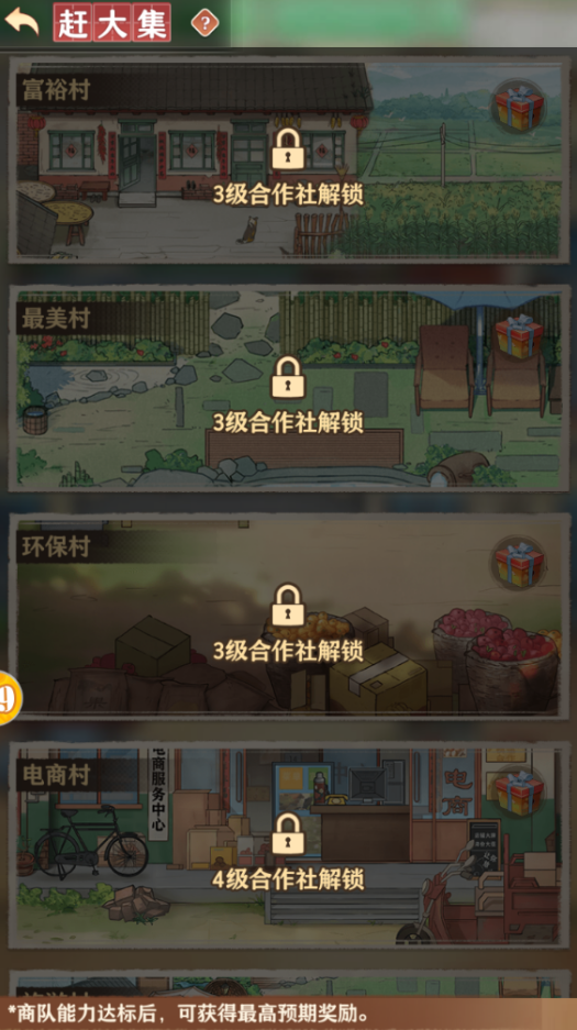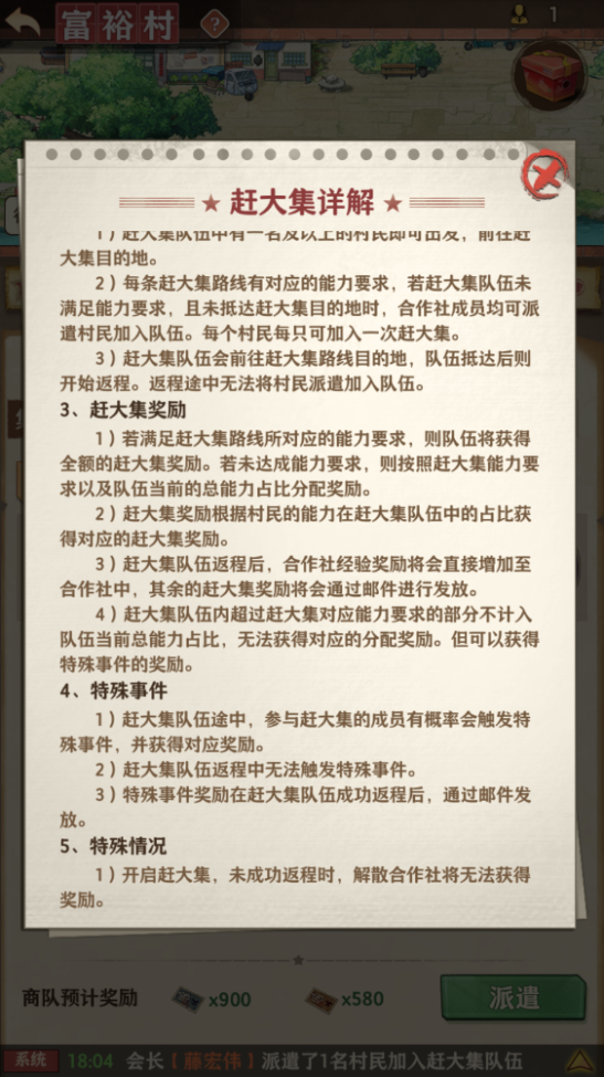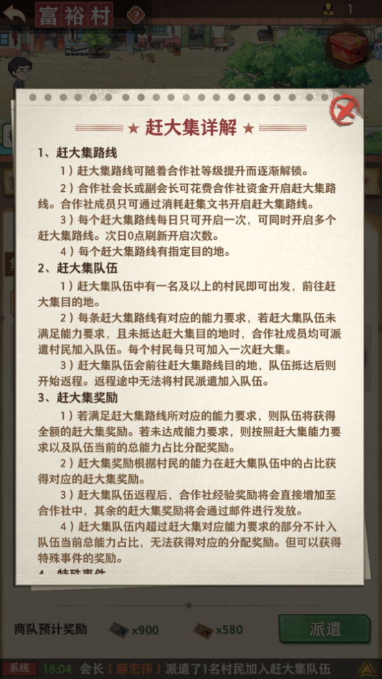 2.開啟后社員可以派遣村民趕集加入隊伍,趕集過程中會偶遇各種事件給到不同獎勵,趕集完成會增加合作社經(jīng)驗,而隊伍成員還會額外收到獎勵