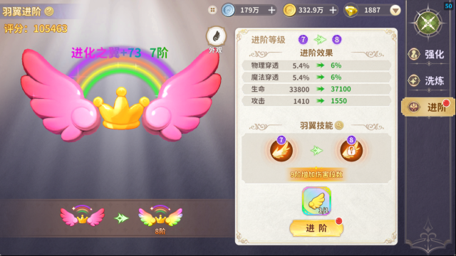 強(qiáng)化:強(qiáng)化羽翼必定成功,可以提升羽翼的基礎(chǔ)屬性,如攻擊力、防御力等。