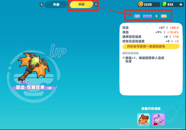比如巴巴六在折扣禮包中,購買了“吸血飛蝠王”的紫裝,便可以在裝備的養(yǎng)成界面中,通過“升階”將其升級為橙裝(傳說品質(zhì))。